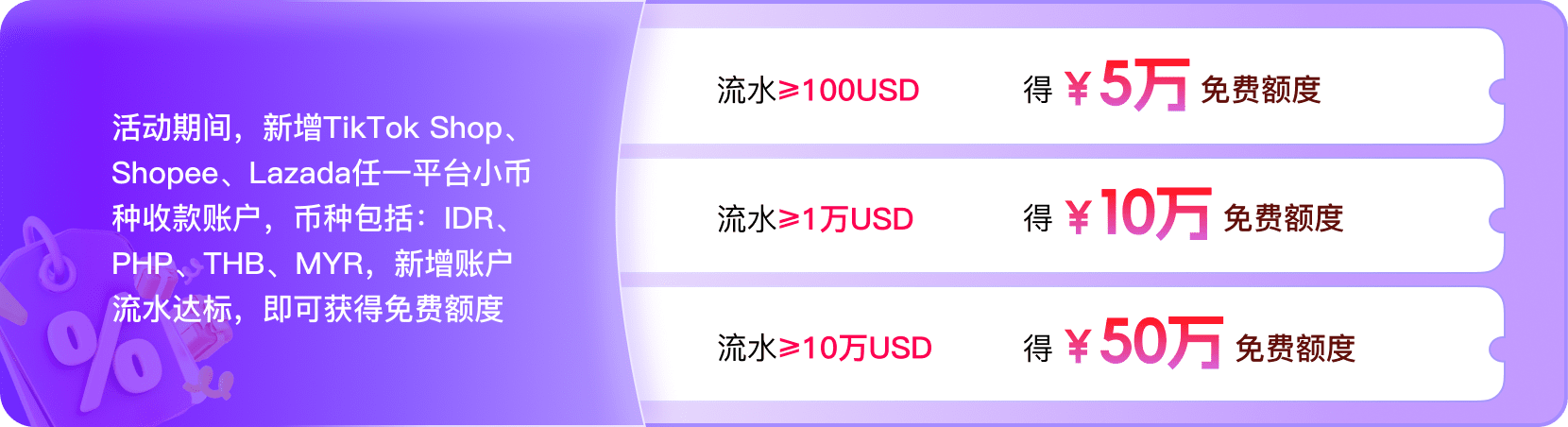活动期间,新增TikTok Shop、Shopee、Lazada任一平台小币种收款账户,币种包括: