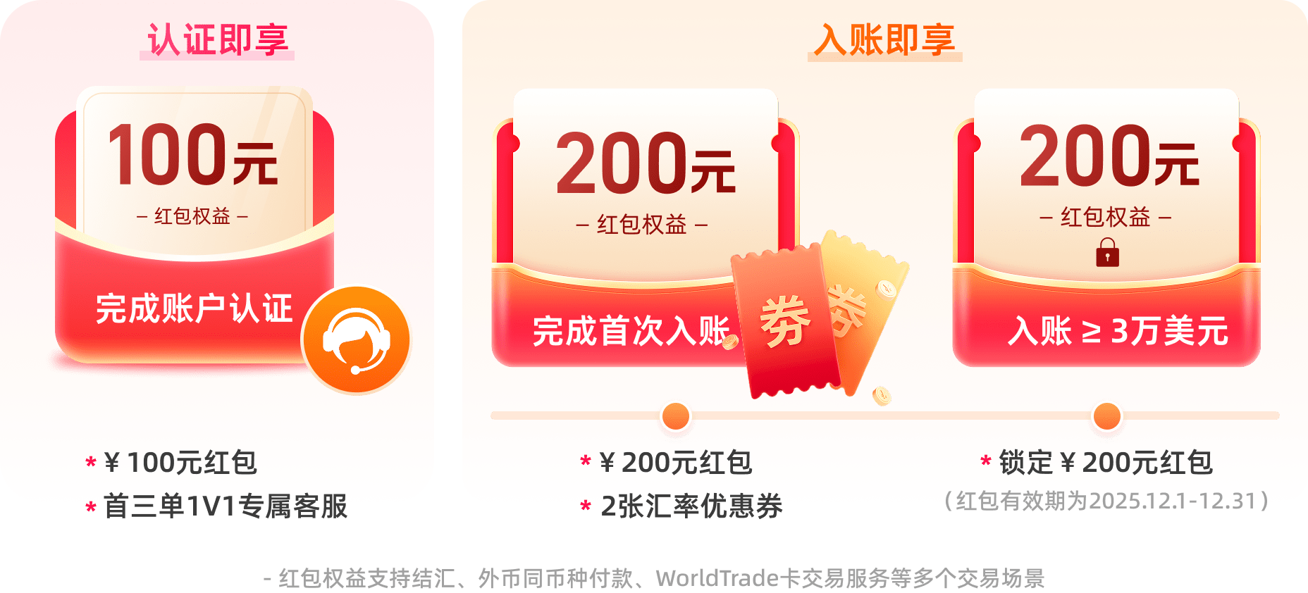 Promotion details: Participants who meet the activity requirements and complete account authentication within the validity period of the activity will receive a ¥100 fee deduction benefit;Participants who complete the first funds-in will receive a ¥100 fee deduction benefit and Exchange Rate Experience Coupon×2;Participants who complete the first funds-in with an amount of $30,000 or more will Lockable ¥200 fee deduction benefit (valid from December 1 to December 31, 2025).