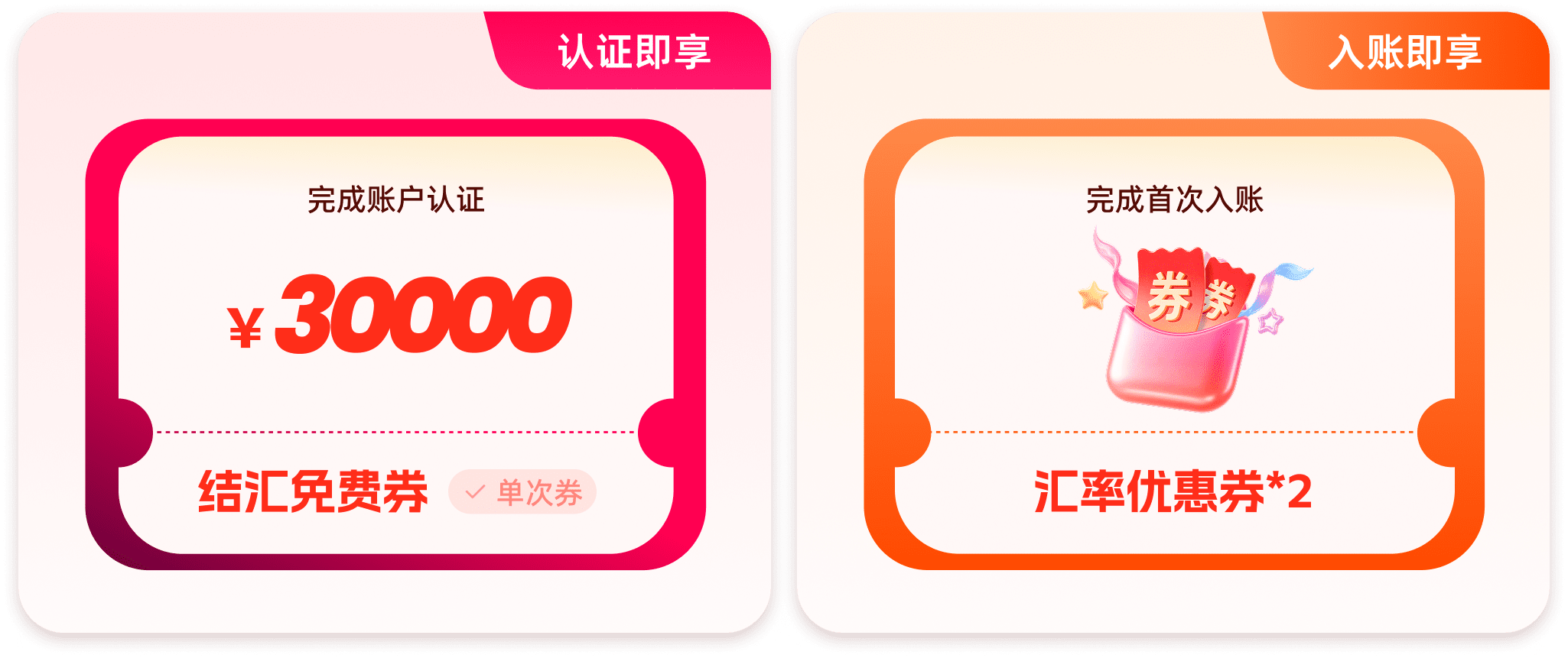 活动攻略:符合活动要求的活动对象,在活动有效期内完成账户认证可得¥3万结汇免费券(单次券);完成首次入账可得2张外币汇率优惠券。